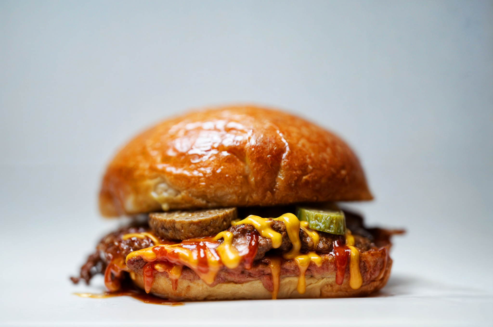Buns potato, steak smash, fromage de Savoie, pickles, sauce gyros, oignon rouge, bacon