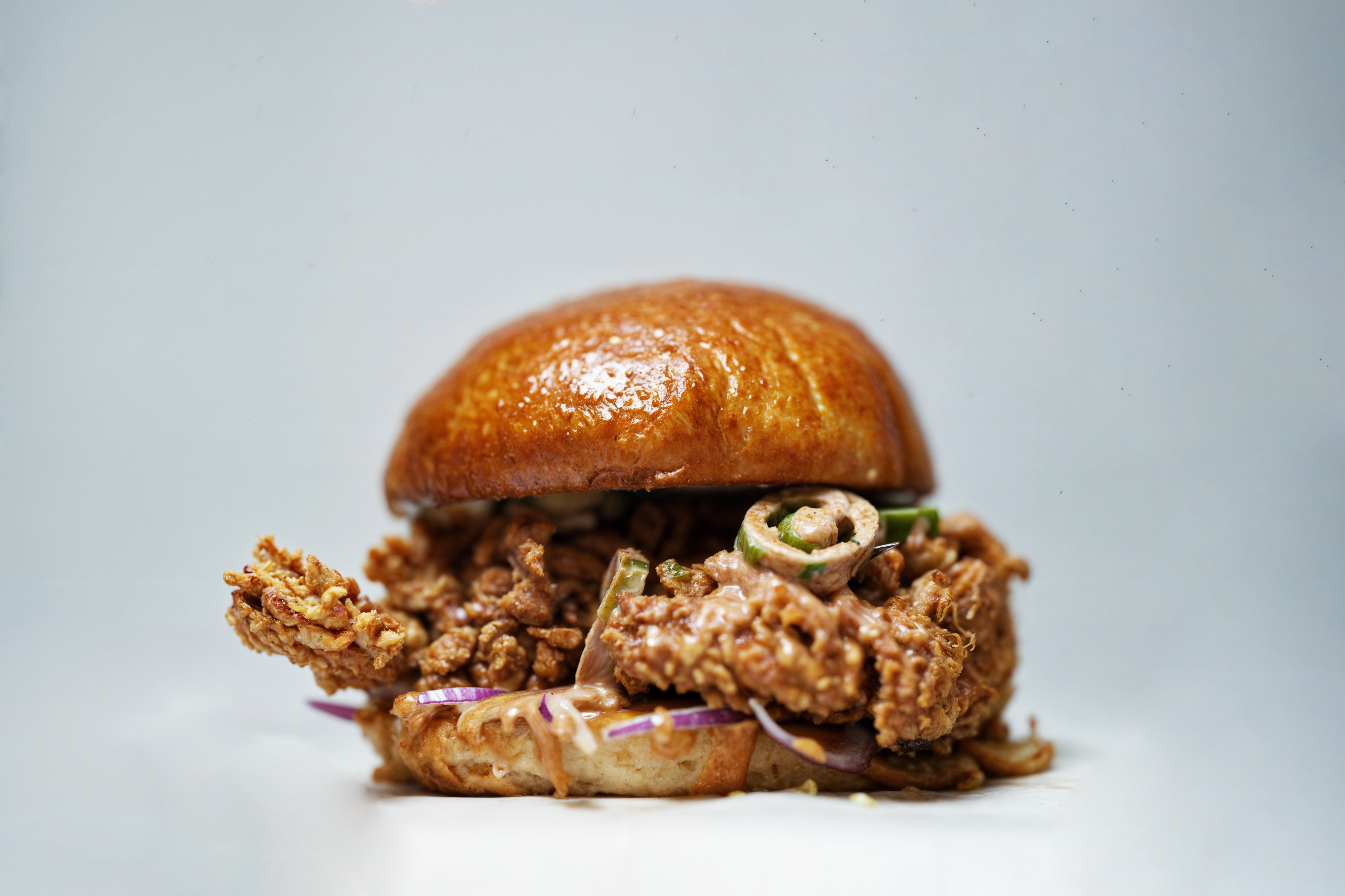 Buns potato, poulet frit, oignons, guacamole, piment japaleno, sauce Bunbury
